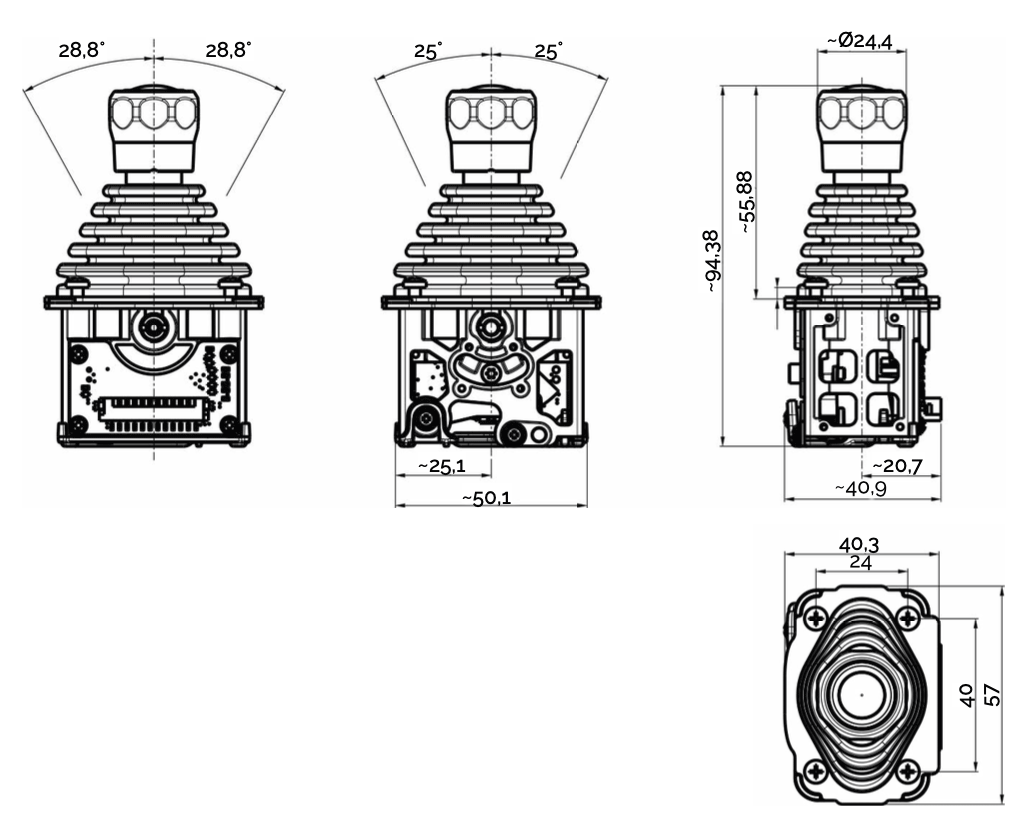 The AL-04 single axis with switch analogue 25° joystick version has these common features: